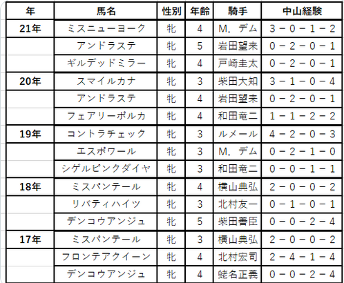 過去5年の複勝圏内馬+中山経験(レース後も含む)